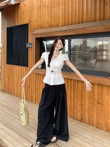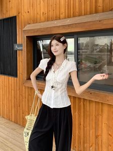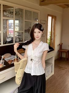 法式复古荷叶边短袖衬衣女夏季白色小众别致收腰显瘦气质衬衫上衣
