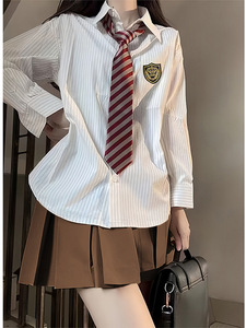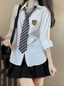 蓝色条纹衬衫上衣女春秋外穿百搭学院风韩系衬衣jk制服百褶裙套装