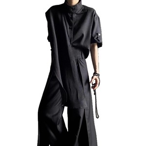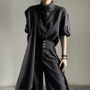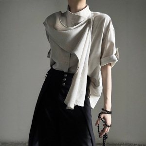 夏季复古设计感围巾飘带短袖衬衫山本风法式中性风Le风衬衣男女潮