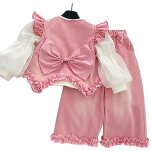 春秋女童套装新款2025花朵牛仔背心上衣打底衫花边阔腿裤三件套