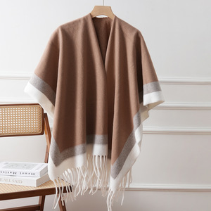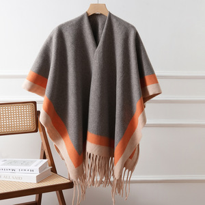 复古拼色仿羊绒流苏披肩女士秋冬时尚百搭高级感保暖外搭披风斗篷