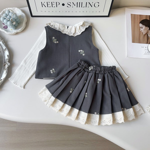 女童学院风洋气套装春秋季新款儿童绣花马甲百褶裙两件套BCB071
