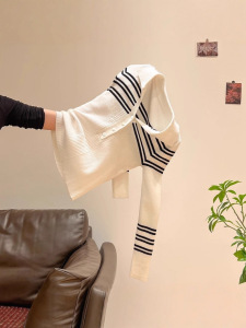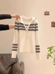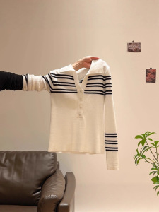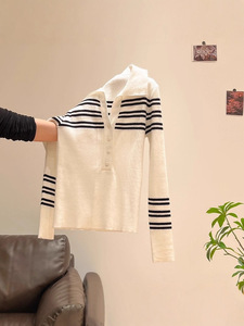 黑白条纹polo领针织打底衫女2025年春季修身显瘦软糯气质v领上衣