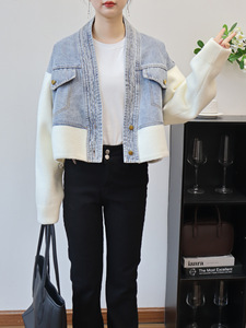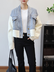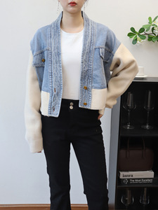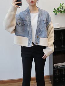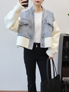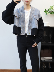短款拼接牛仔针织双面呢开衫2025秋冬新款韩版宽松气质毛衣外套女