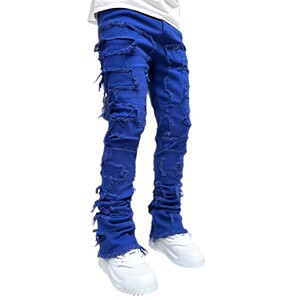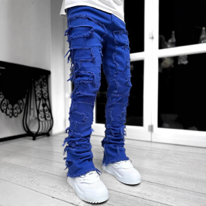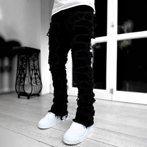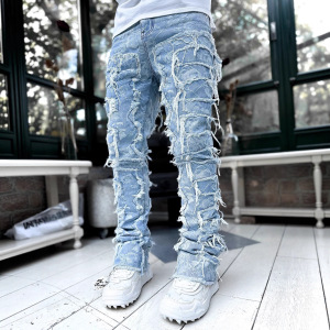 跨境亚马逊WISH欧美男士时尚潮流ins弹力流苏贴布牛仔直筒裤长裤