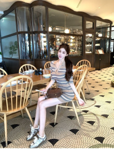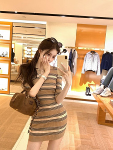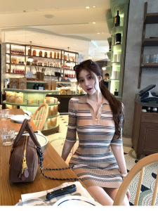 老钱风摩卡棕条纹翻领针织包臀裙女2025夏季收腰显瘦polo领连衣裙