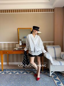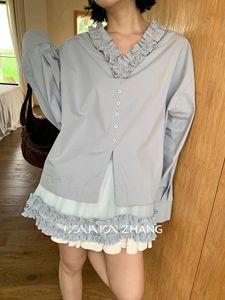 CZ ZHANG秋季法式俏皮少女花边纱网拼接v领层次感小众衬衫B33302