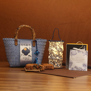 复古手工编织篮棕色+诗意中秋手提款+非遗郭师傅月饼