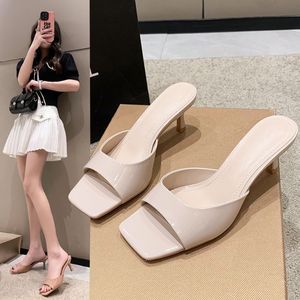 时尚复古简约粗跟露趾凉鞋女新款夏季纯色方头一字带高跟拖鞋