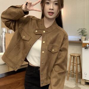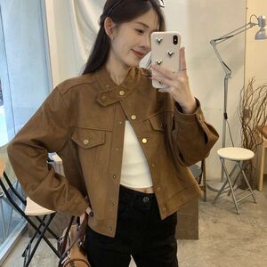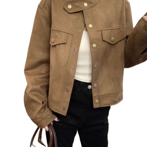 美拉德穿搭立领洋气外套女秋冬感复古宽松短款夹克麋鹿皮外套
