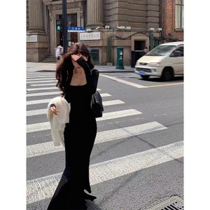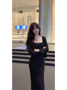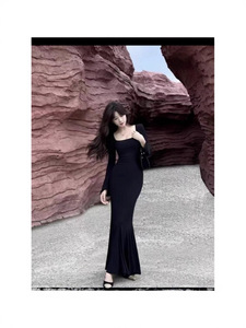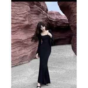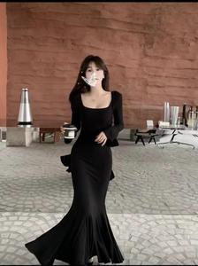 歌黛璐 方领长袖鱼尾包臀连衣裙女秋冬气质高级修身步步生莲长裙