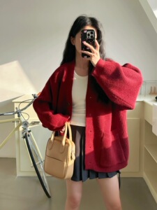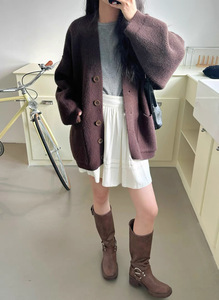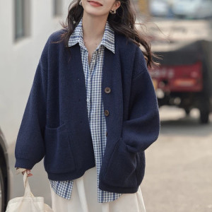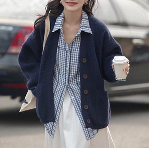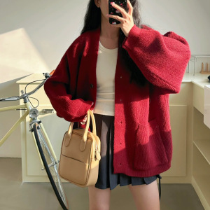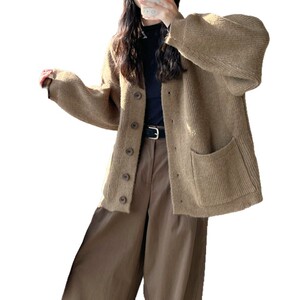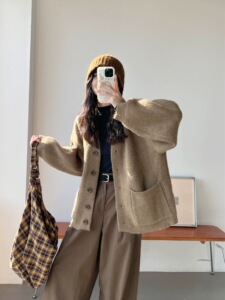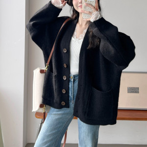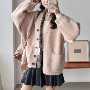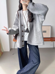 新款慵懒气质针织开衫纽扣口袋毛衣外套女春秋软糯V领宽松中长款
