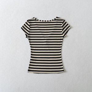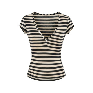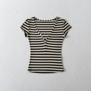 好穿莱赛尔纯欲辣妹轻薄修身V领条纹短袖T恤女弹力显瘦正肩上衣夏