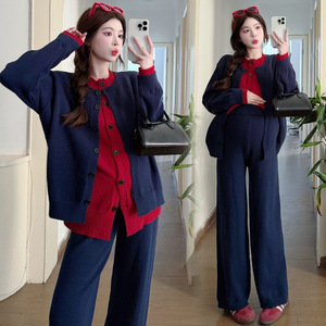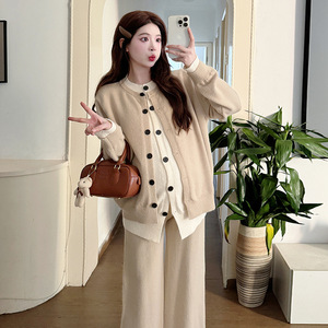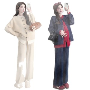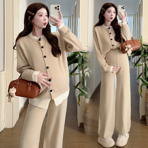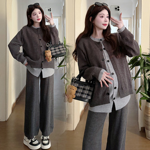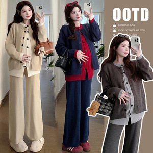 2025孕妇秋冬套装慵懒风简约撞色拼接假两件阔腿针织长裤两件套潮