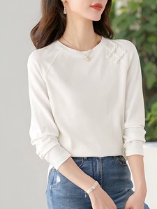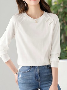 长袖纯棉正肩盘扣t恤女春秋新款设计感小众气质减龄白色圆领上衣