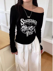 欧洲站2025早秋新款女韩版时尚斜肩宽松显瘦百搭长袖字母T恤上衣