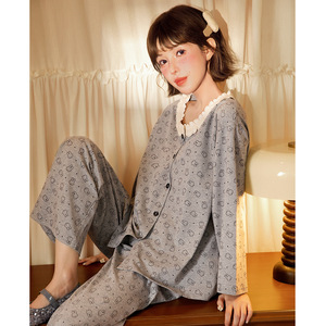 润妈【轻柔软】米菲睡衣女长袖纯棉家居服可爱满印花边开衫家居服