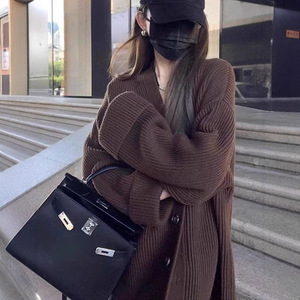 韩系复古开衫针织毛衣外套女春秋新款v领慵懒风宽松中长款针织衫