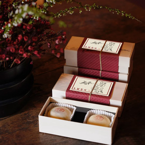 4格隔断木盒一只15x15x5cm+红色月饮中秋围边+随机中秋吊牌+酒红皮绳一个