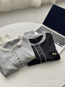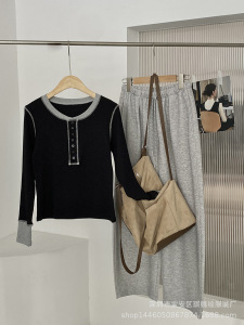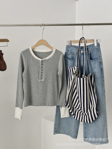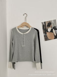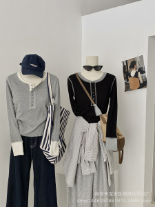 琪镌绘制秋季韩版圆领长袖撞色t恤修身拼接女上衣纯色打底衫2336