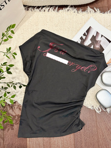 现货/宅女粉色亮闪闪字母斜肩不规则辣妹短袖T恤上衣女