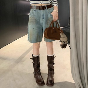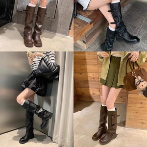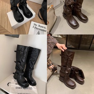 现货~葡萄妈同款 增高6cm~时髦皮带扣方圆头褶皱中筒骑士靴女秋