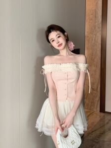 纯欲甜辣妹一字肩露肩小上衣女夏季芭蕾风蕾丝边鱼骨法式绝美短袖