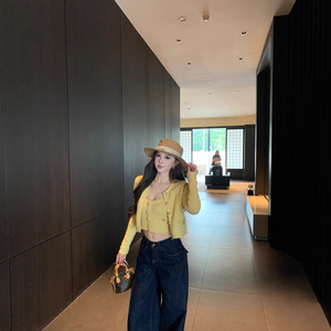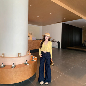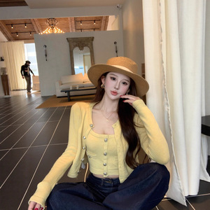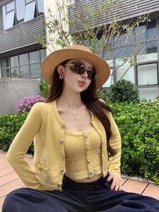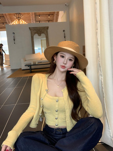 【暖秋黄槿】小香风时尚针织套装女短款针织开衫+吊带背心两件套