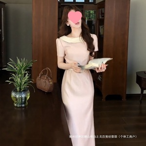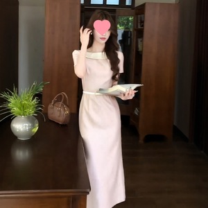 跨境法式温柔风粉色短袖连衣裙女夏季新气质减龄腰显瘦开叉长裙子
