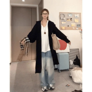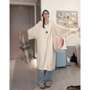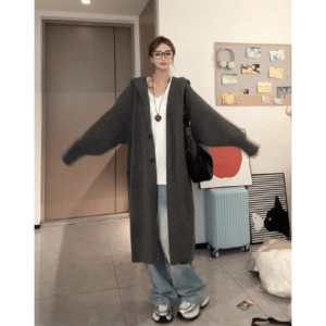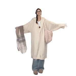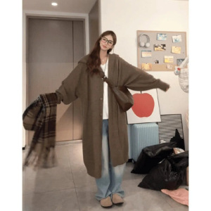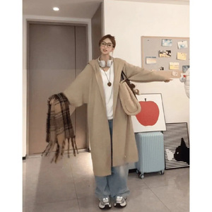 秋冬新款慵懒风毛衣外套韩系宽松版二粒扣连帽针织开衫中长款显瘦