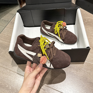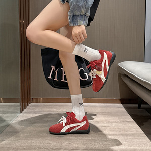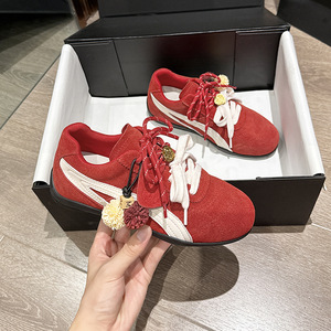复古红色平底松果德训鞋女2025新款内增高双系带轻便休闲鞋阿甘鞋