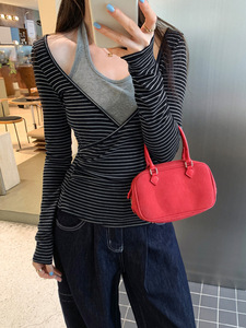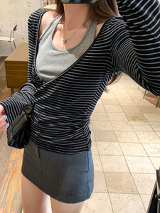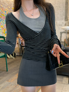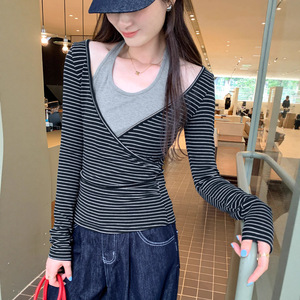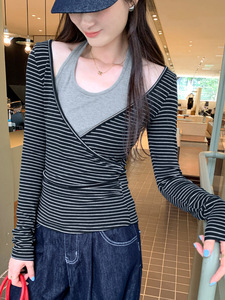 美式内搭打底衫女秋季高级感假两件t恤条纹长袖外穿独特绝美上衣