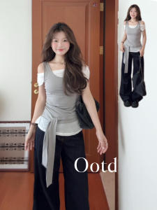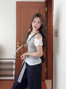 韩系一字露肩假两件短袖t恤女夏季设计感辣妹修身收腰绑带上衣ins