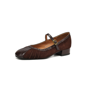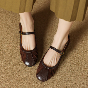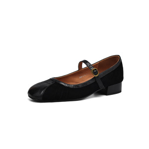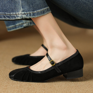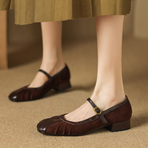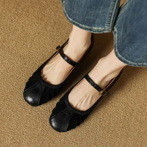 文艺百搭羊皮拼接玛丽珍2025秋粗低跟圆头真皮一字扣单鞋女大小码