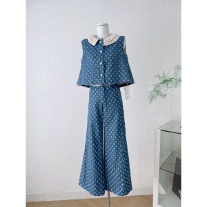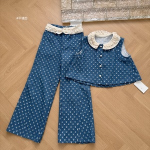 蕾丝边上衣阔腿长裤女夏季直筒牛仔两件套