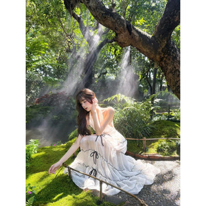 三亚泰国旅游度假沙滩法式重工挂脖上衣&微透黑色走线低腰长裙