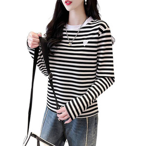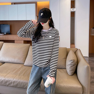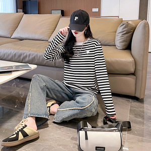 设计感小众条纹长袖t恤女2025新款春秋季薄款宽松内搭打底衫上衣