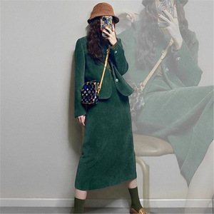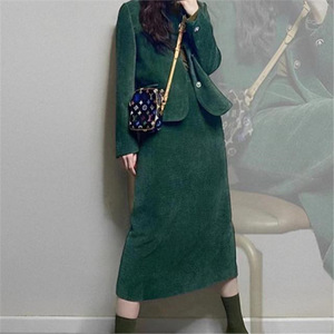 大码胖mm秋冬女加厚名媛高级感复古祖母绿连衣裙子两件套装200斤
