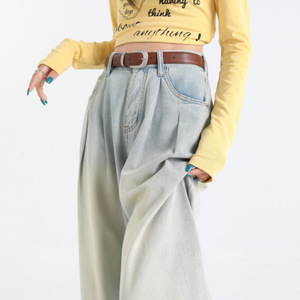 十三行·芸和鱼秋季韩版牛仔阔腿裤女高腰宽松显瘦褶皱设计感长裤
