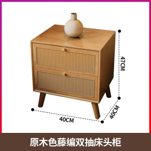 原木色藤编双抽床头柜