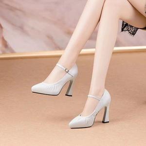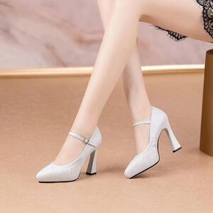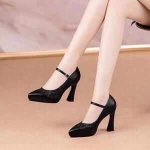 旗袍模特走秀高跟鞋女不累脚防水台粗跟软牛皮单鞋皮尖头工作鞋
