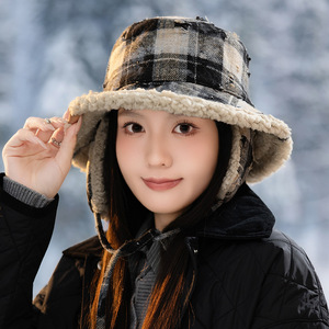 日系复古加绒加厚雷锋帽冬季格子纹防风保暖护耳帽休闲百搭毛绒帽