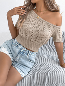 跨境亚马逊休闲露肩镂空麻花短袖针织衫度假短脐短袖上衣女装