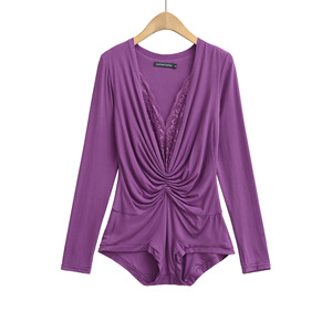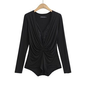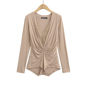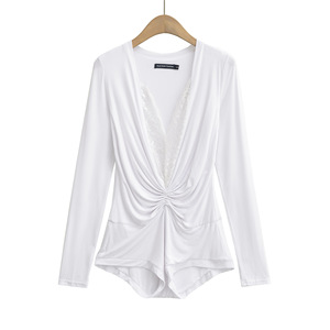 AY719-25夏季新款 韩版辣妹纯欲风蕾丝拼接长袖T恤显瘦V领连体衣