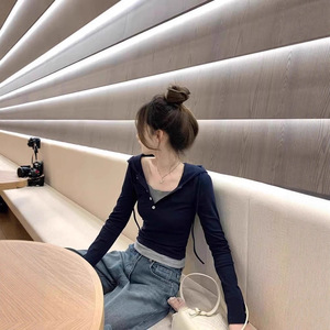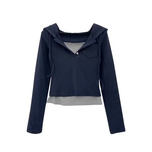 假两件修身连帽长袖t恤女春秋季设计感漂亮小衫独特别致正肩上衣