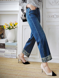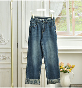 爆款跑量价玫瑰印花翻边牛仔裤中高腰小直筒9分裤女春秋新款复古