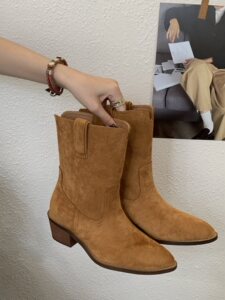 2025年新款复古尖头西部牛仔靴女秋季粗跟中筒马丁靴