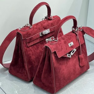 秋冬新款磨砂皮宽肩带凯莉包包麂皮头层牛皮手提单肩斜挎包高级感