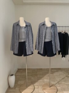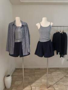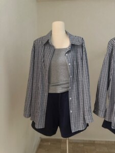 秋季蓝色格子衬衫+吊带背心+短裤三件套套装