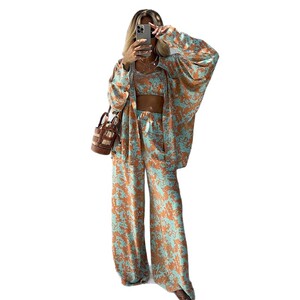 欧美女装2025秋新款甜美清新印花翻领衬衫背心高腰直筒长裤三件套